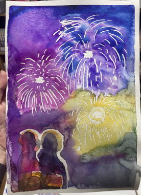 大輪の花火が透明水彩でとっても素敵に表現されいます。