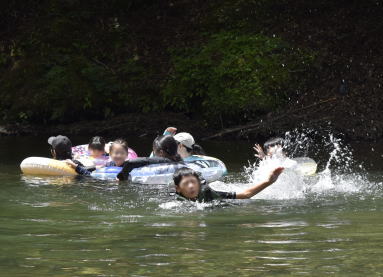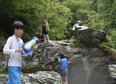 岸辺では、水鉄砲での水かけ合戦が繰り広げられました。 |